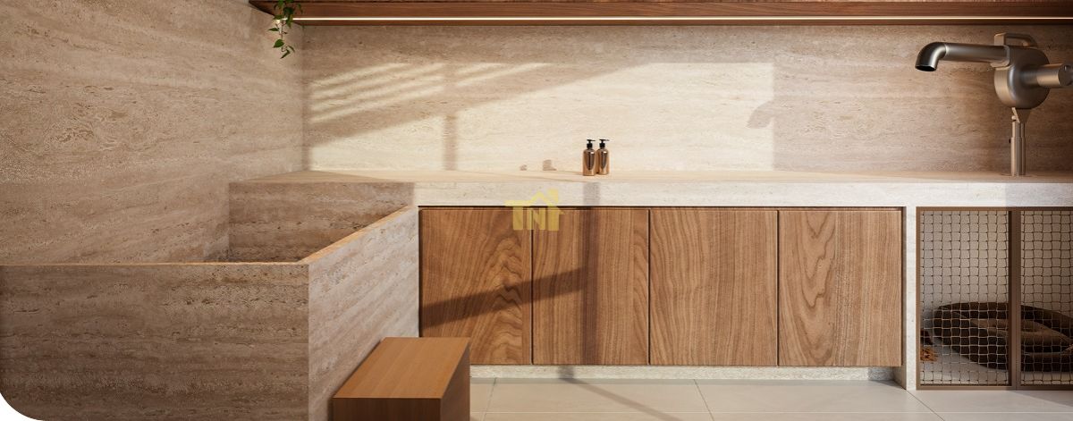 Nichos embutidos e tampos em mármore nos banheiros